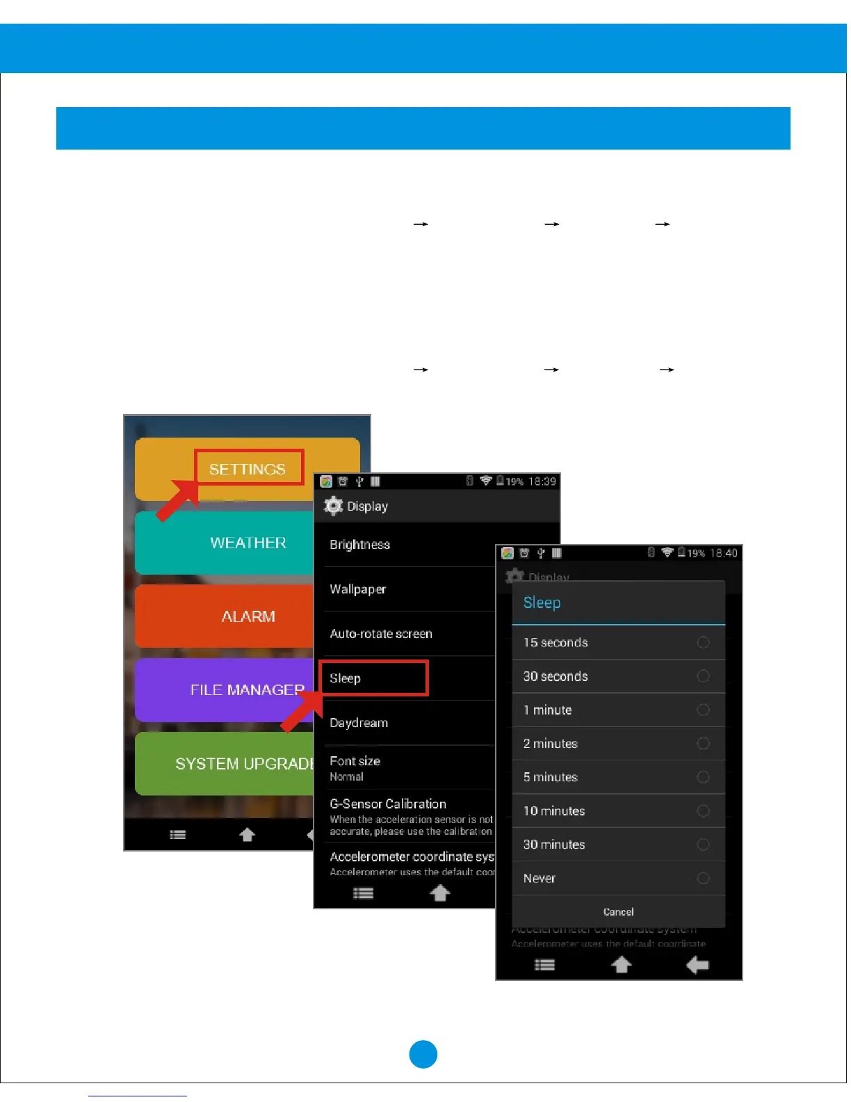 1. From Home screen, touch "SETTINGS" "SETTINGS" "Display" "Sleep".