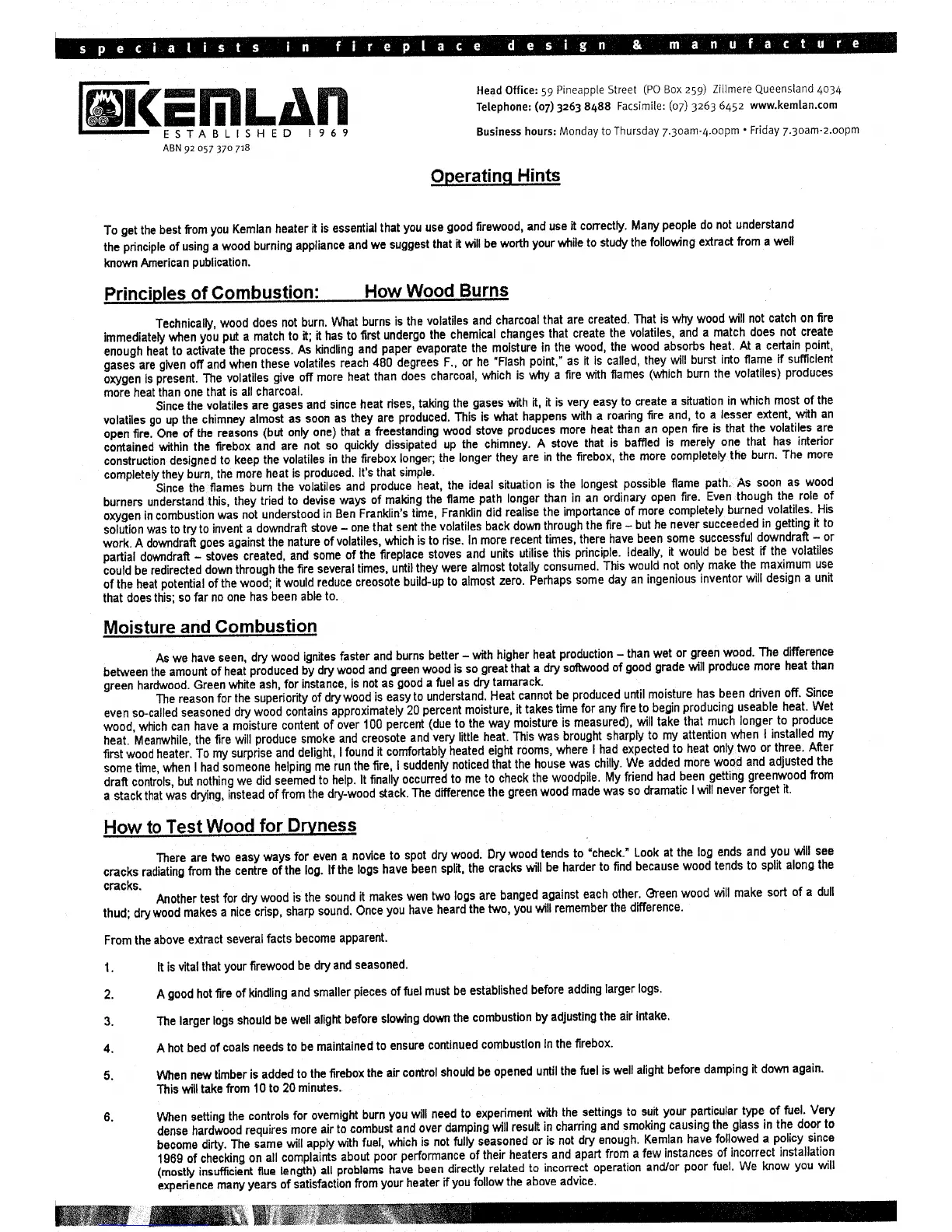Kemlan Super Nova - Operating Hints; Principles of Combustion; Moisture and Combustion; How to Test Wood for Dryness