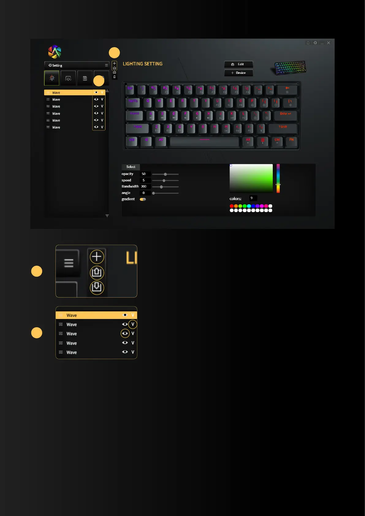 Kemove 61 - Lighting Settings Customization; Lighting Layer Management; Lighting Effect Selection