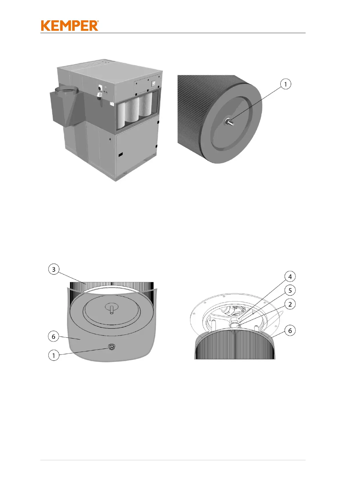 5. Die Muttern/Scheibe (Pos. 1) im unteren Bereich der Filterpatrone lösen,