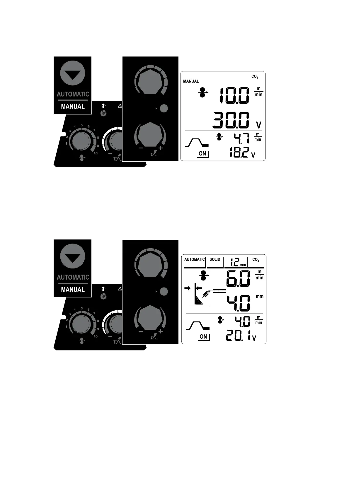 shows no Automatic mode information, such as welding wire thickness.