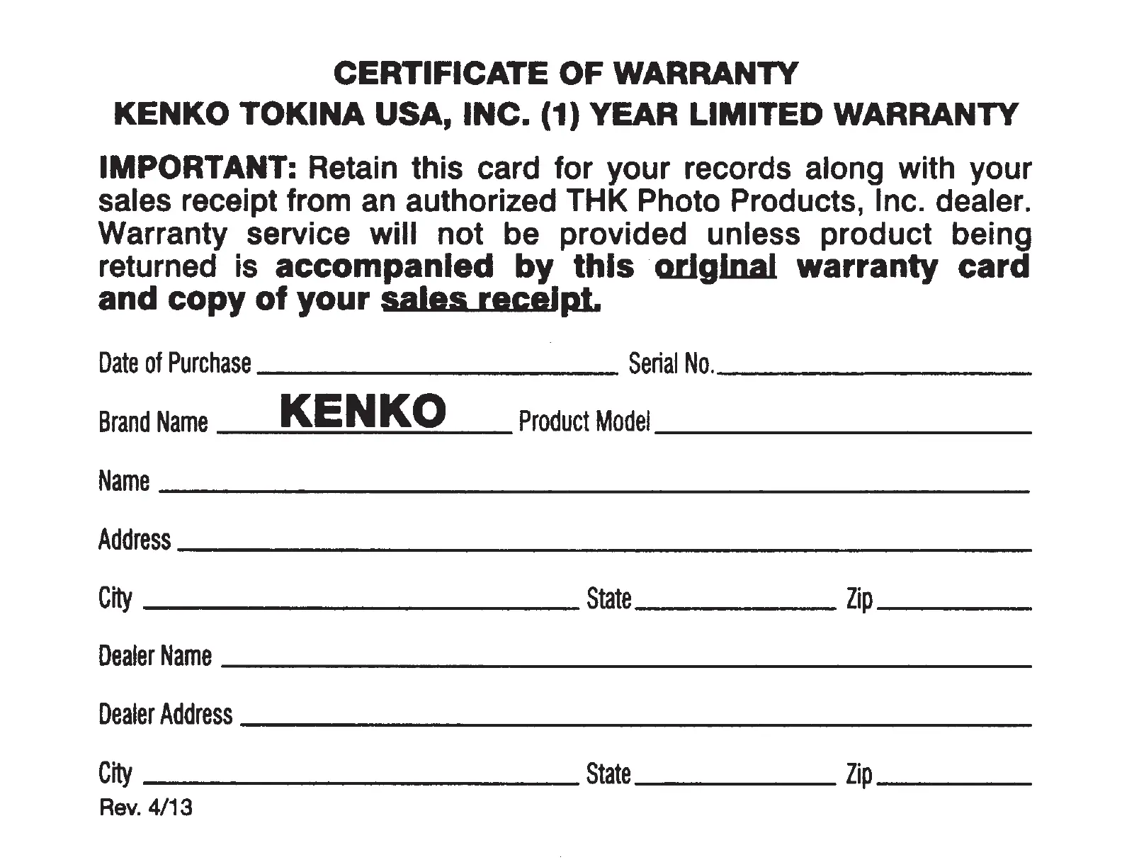 sales receipt from an authorized THK Photo Products, Inc. dealer.