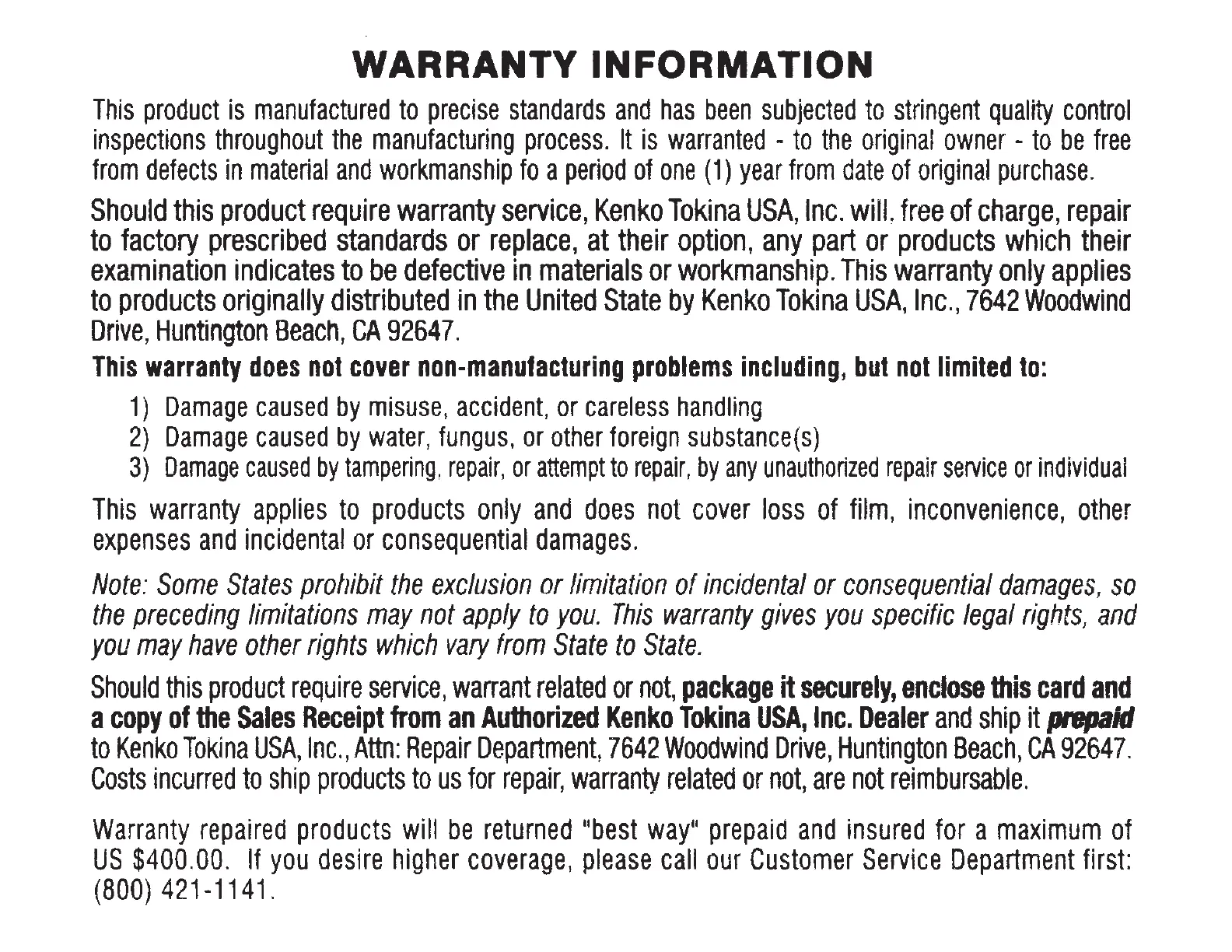 Kenko TELEPLUS HD 2x DGX - Warranty Terms and Conditions