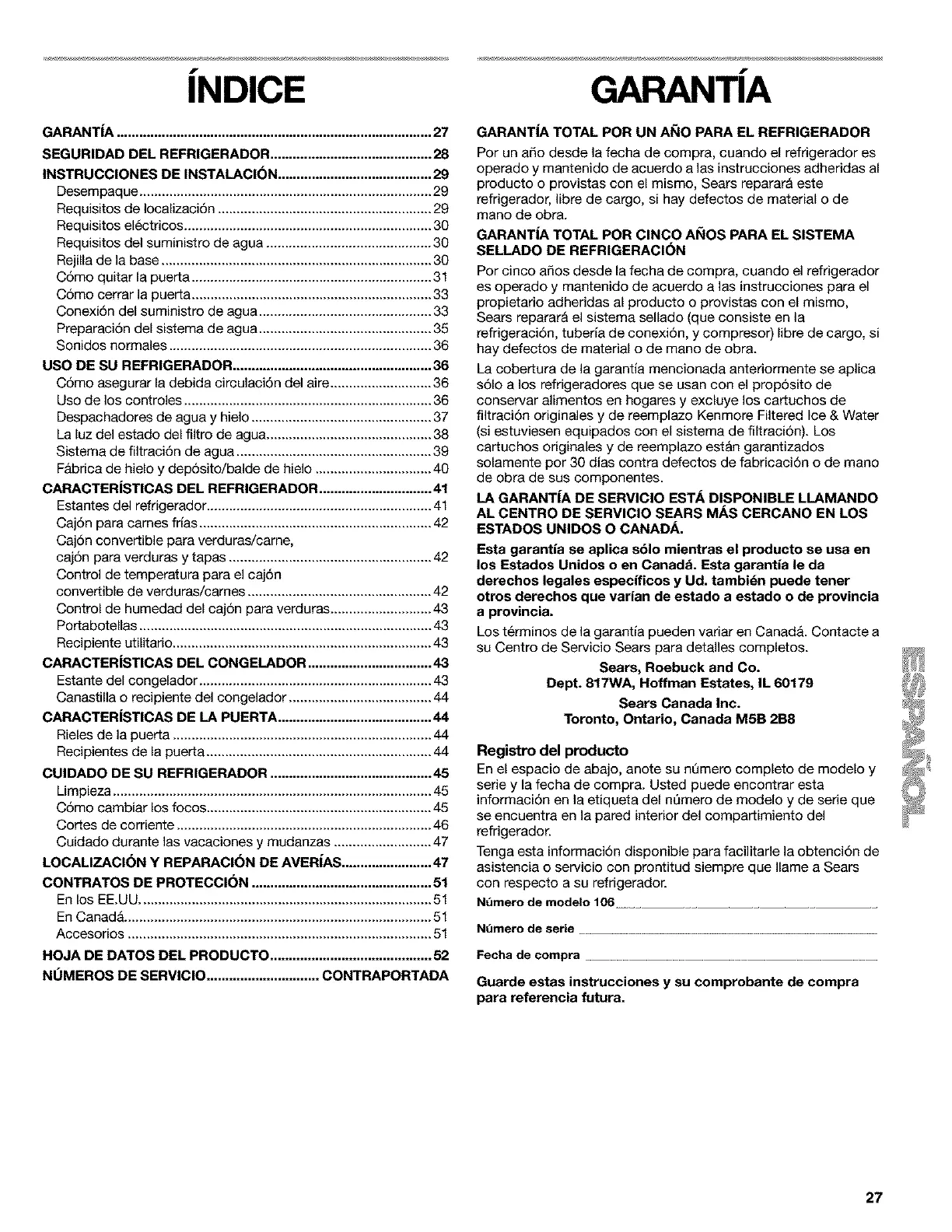 su Centro de Servicio Sears para detalles completos.