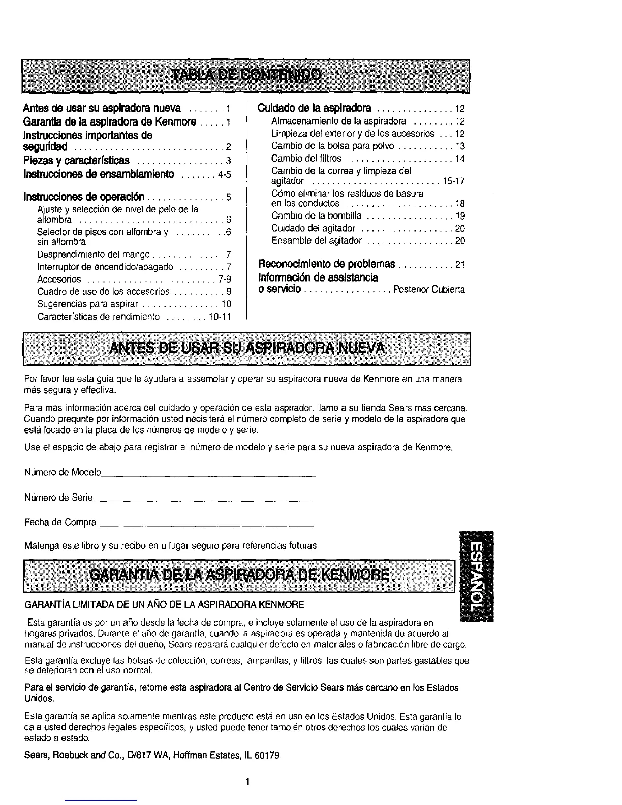 Potfavor lea esta guia que le ayudara a assemblary operar su aspiradora nueva de Kenmoreen una manera