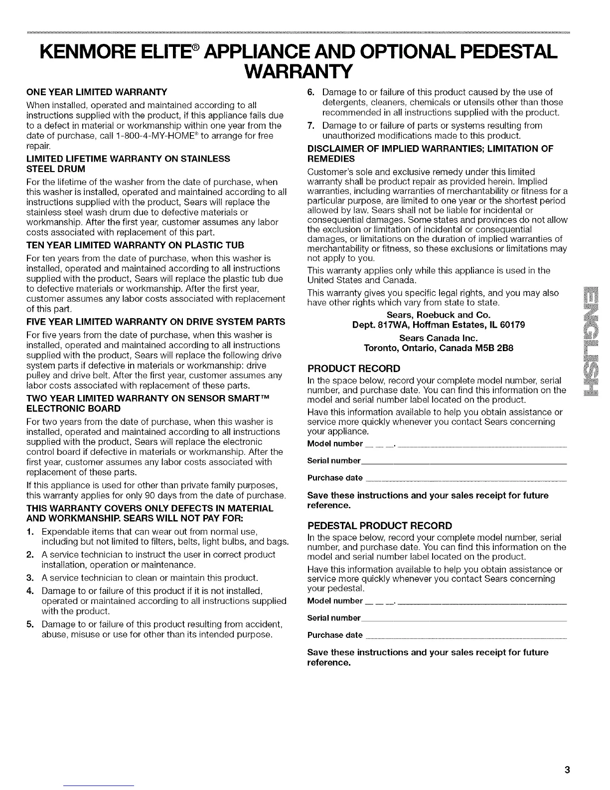 supplied with the product, Sears will replace the electronic
