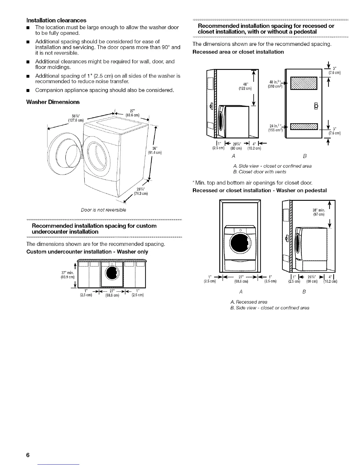 • Additional spacing of 1" (2.5 cm) on all sides of the washer is