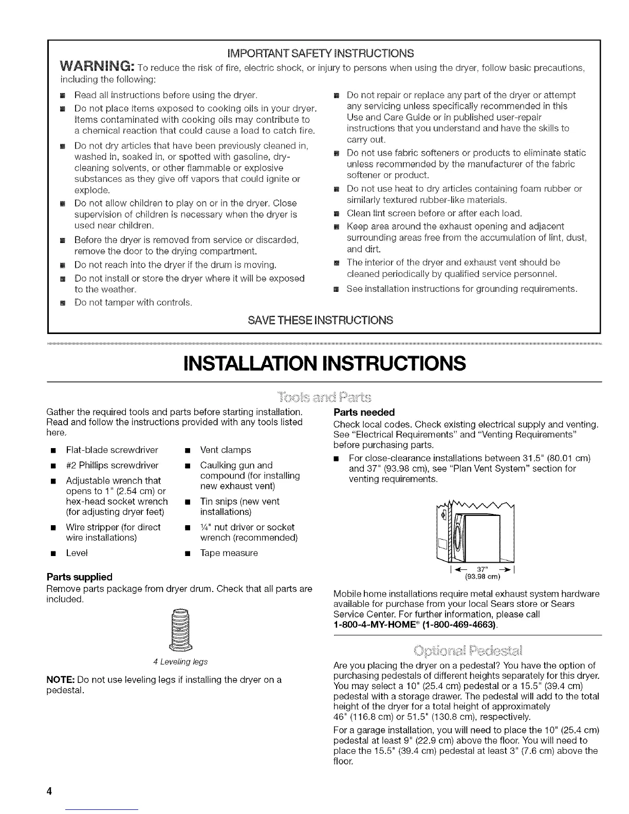 place the 15.5" (39.4 cm) pedestal at least 3" (7.6 cm) above the