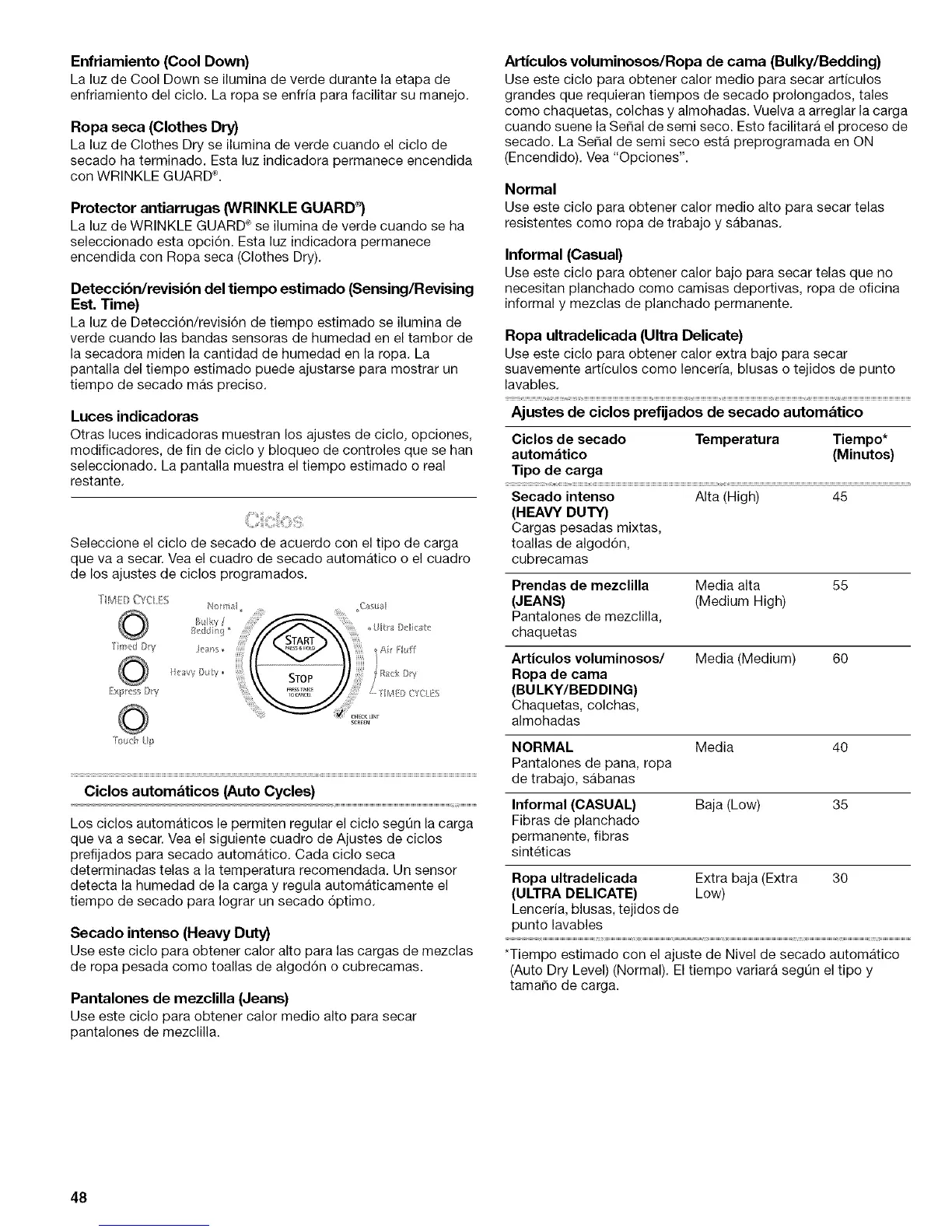 que va a secar. Vea el siguiente cuadro de Ajustes de ciclos