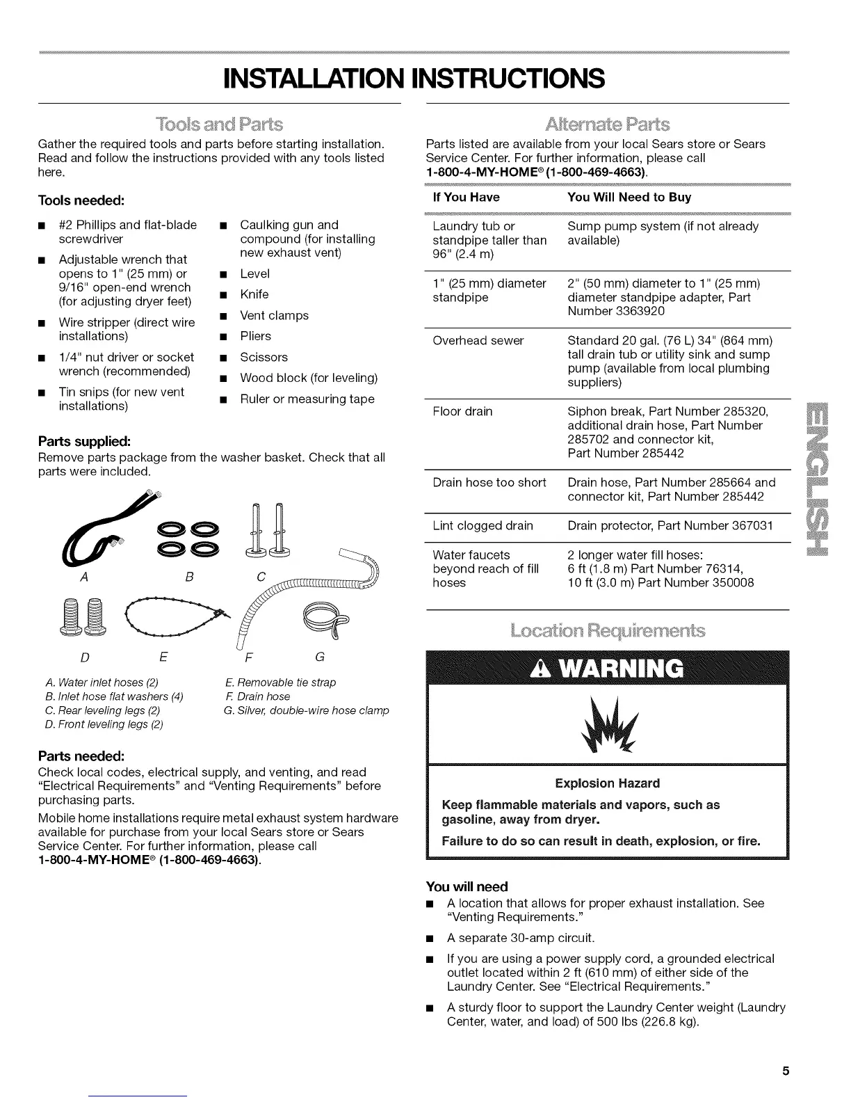 Kenmore 110.88752 - INSTALLATION INSTRUCTIONS; Tools and Parts; Location Requirements