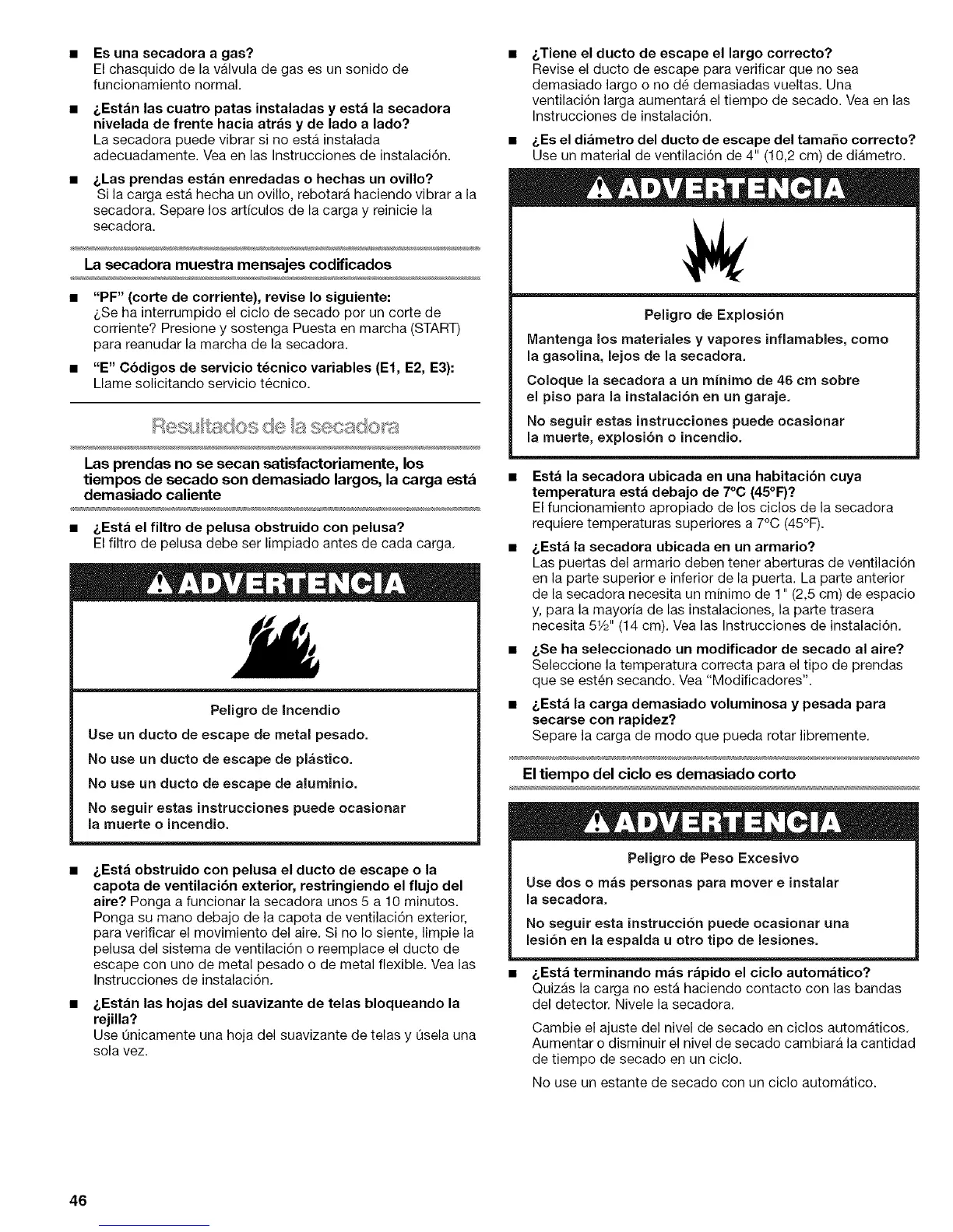 Coloque la secadora a un minimo de 46 cm sobre