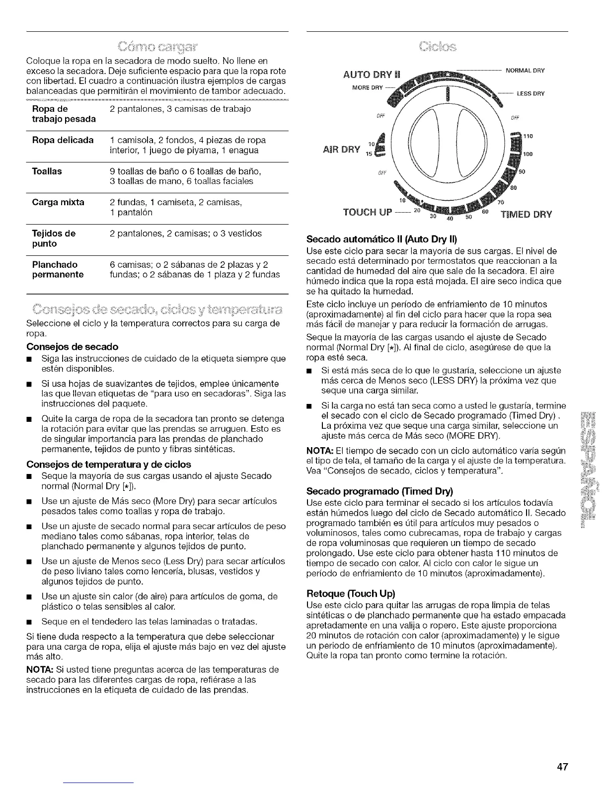 secado para las diferentes cargas de ropa, refierase alas