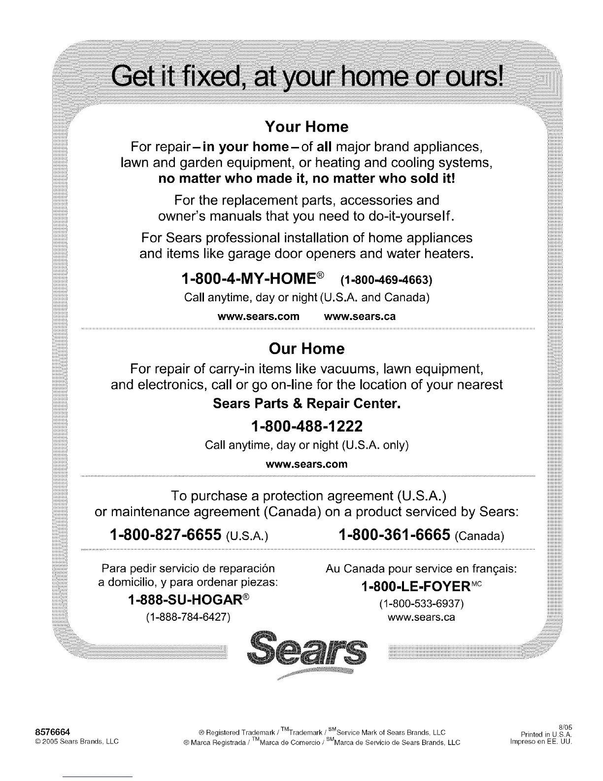 © 2005 Sears Brands, LLC ® Marca Reg_strada / Marca de Comercio / SMMarca de Servicio de Sears Brands, LLC Impreso en EE. UU.