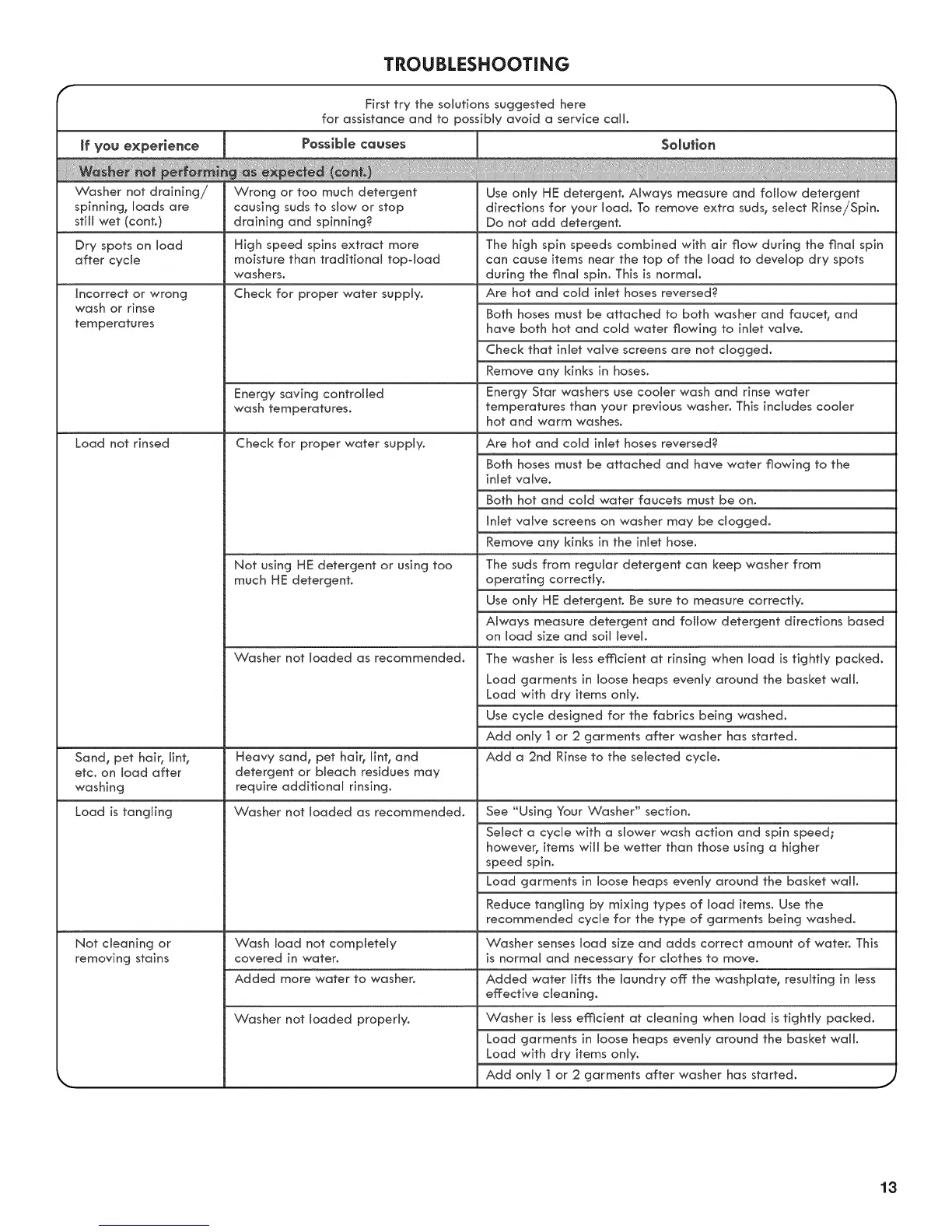 Washer not draining/ Wrong or too much detergent Use only HE detergent. Always measure and follow detergent