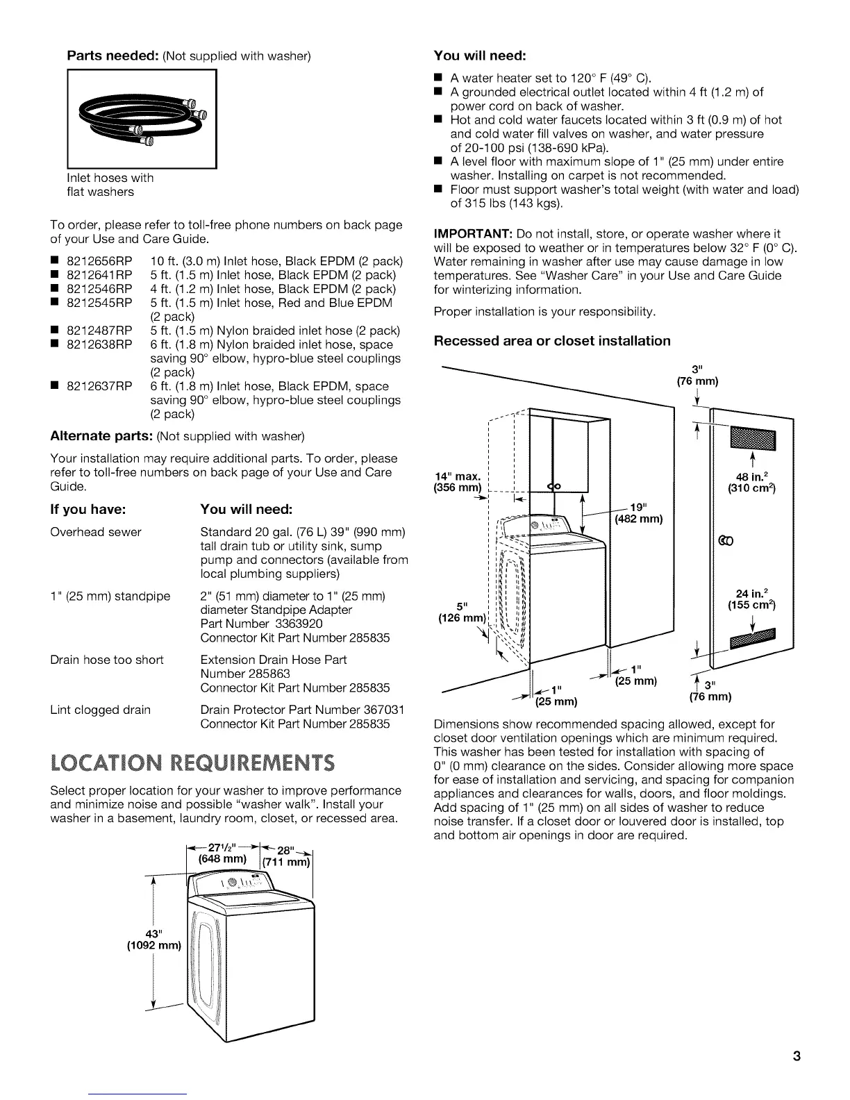 Parts needed: (Not supplied with washer)
