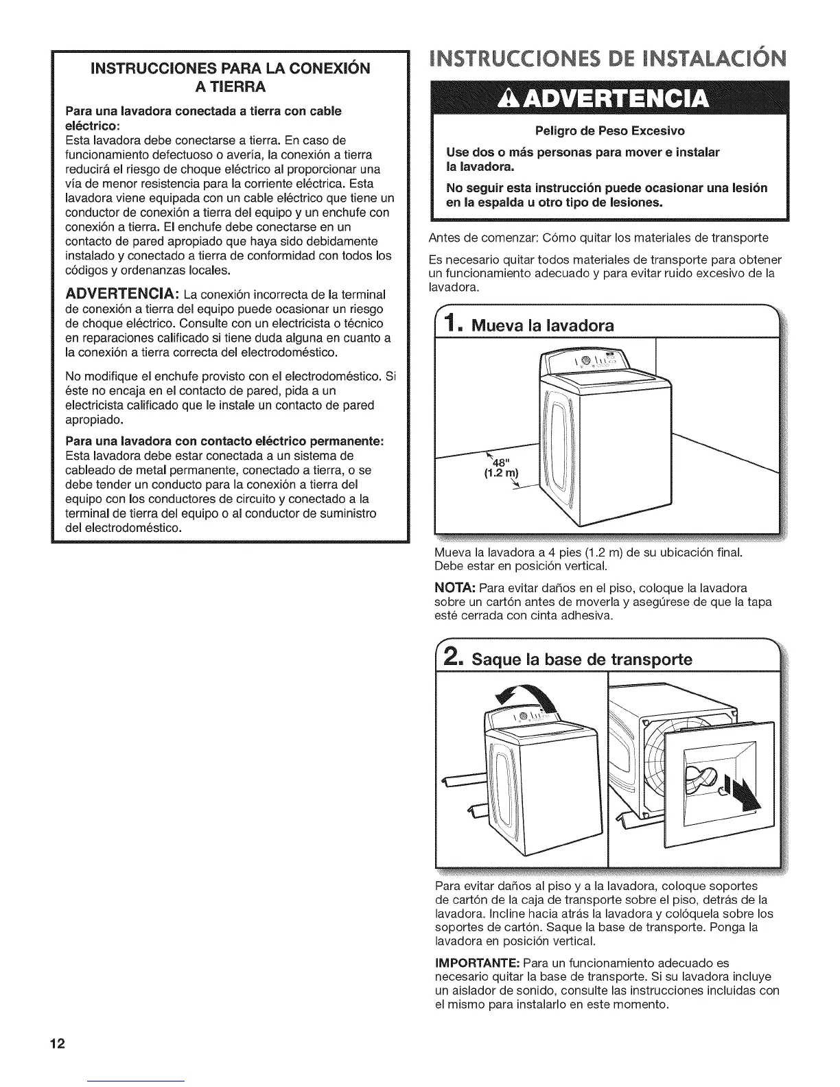 Mueva la lavadora a 4 pies (1.2 m) de su ubicacidn final.
