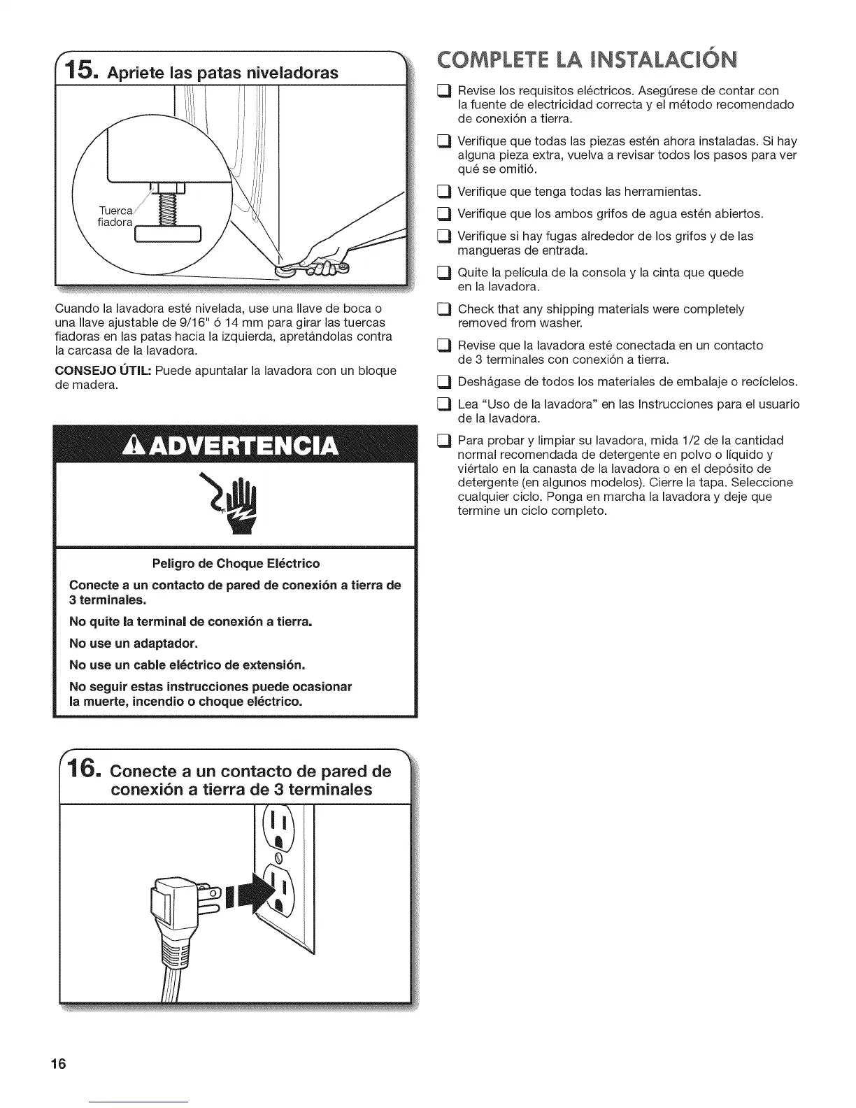 Cuando la lavadora est6 nivelada, use una Ilave de boca o