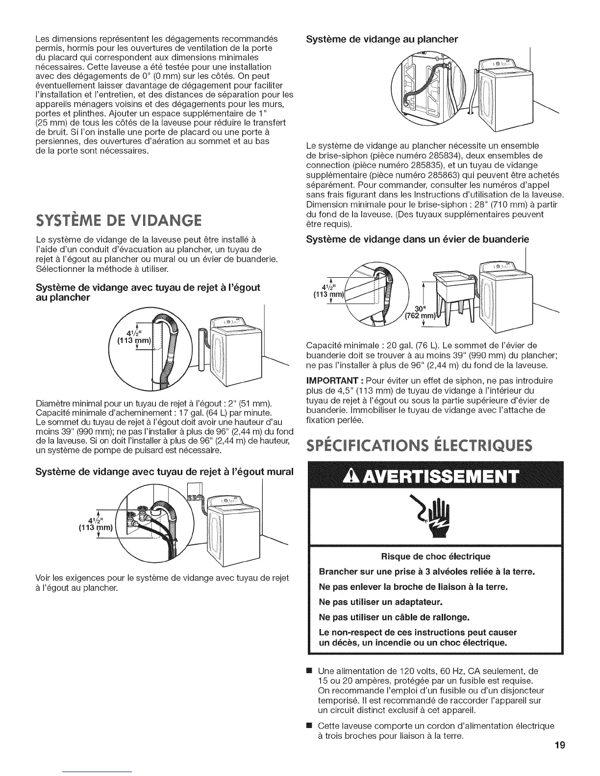 plus de 4,5" (113 mm) de tuyau de vidange & I'int@ieur du