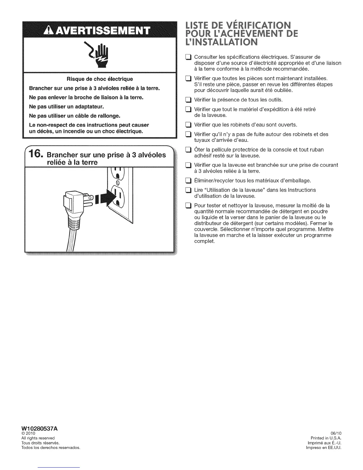 Wrifier que la laveuse est branch6e sur une prise de courant