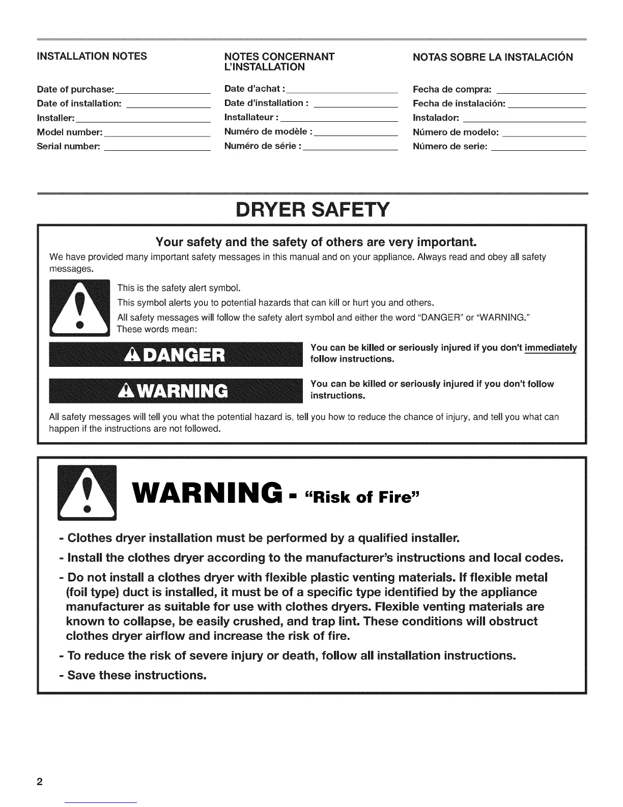 Kenmore 110C66012011 - Dryer Safety; Risk of Fire Warning