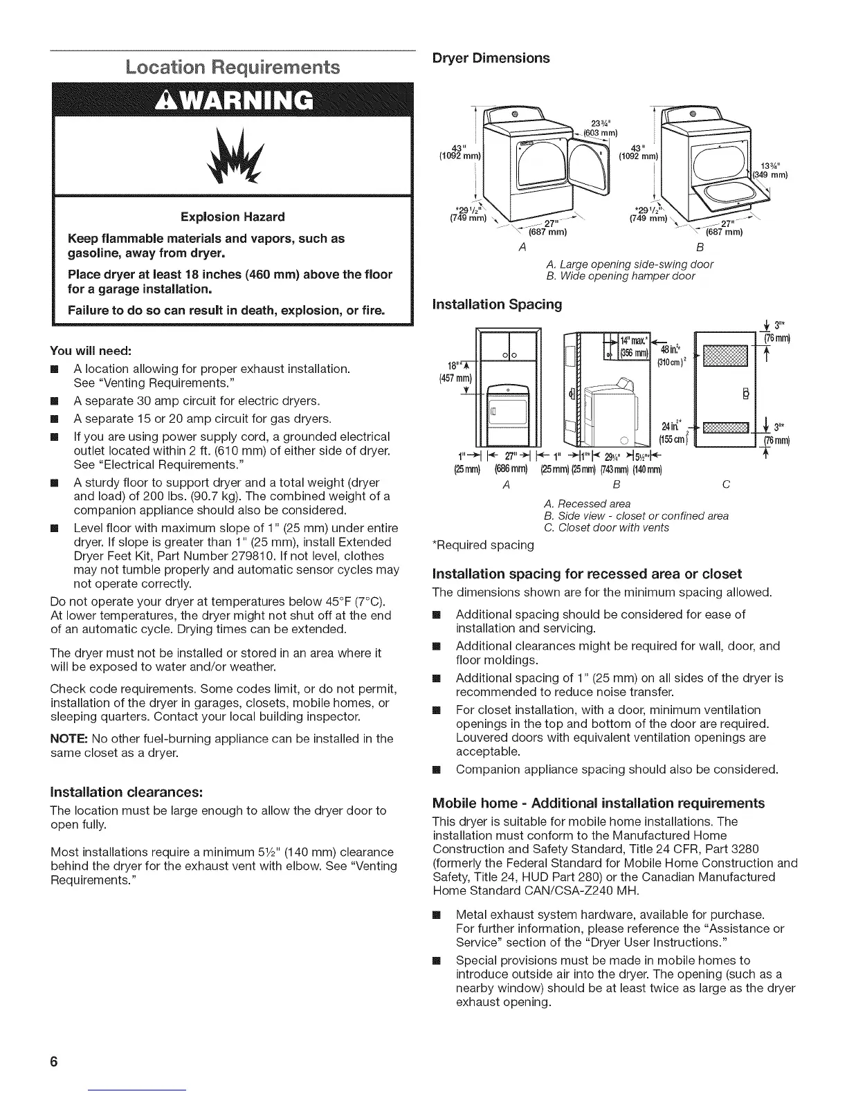 installation of the dryer in garages, closets, mobile homes, or