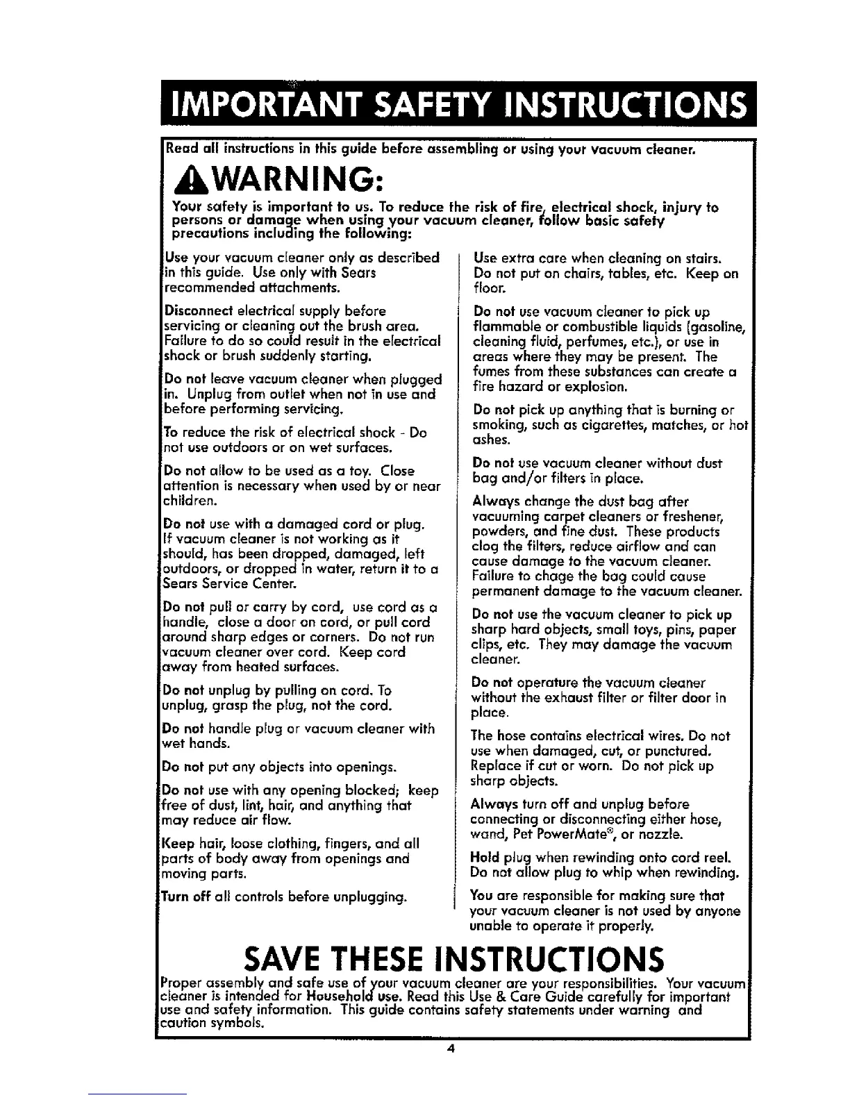 Proper assembly and safe use of your vacuum cleaner are your responslbiJlties. Yourvacuum
