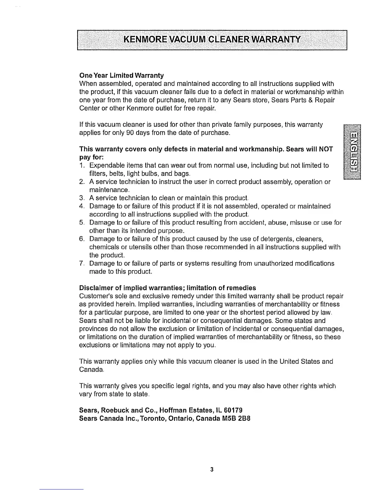 This warranty covers only defects in material and workmanship. Sears will NOT