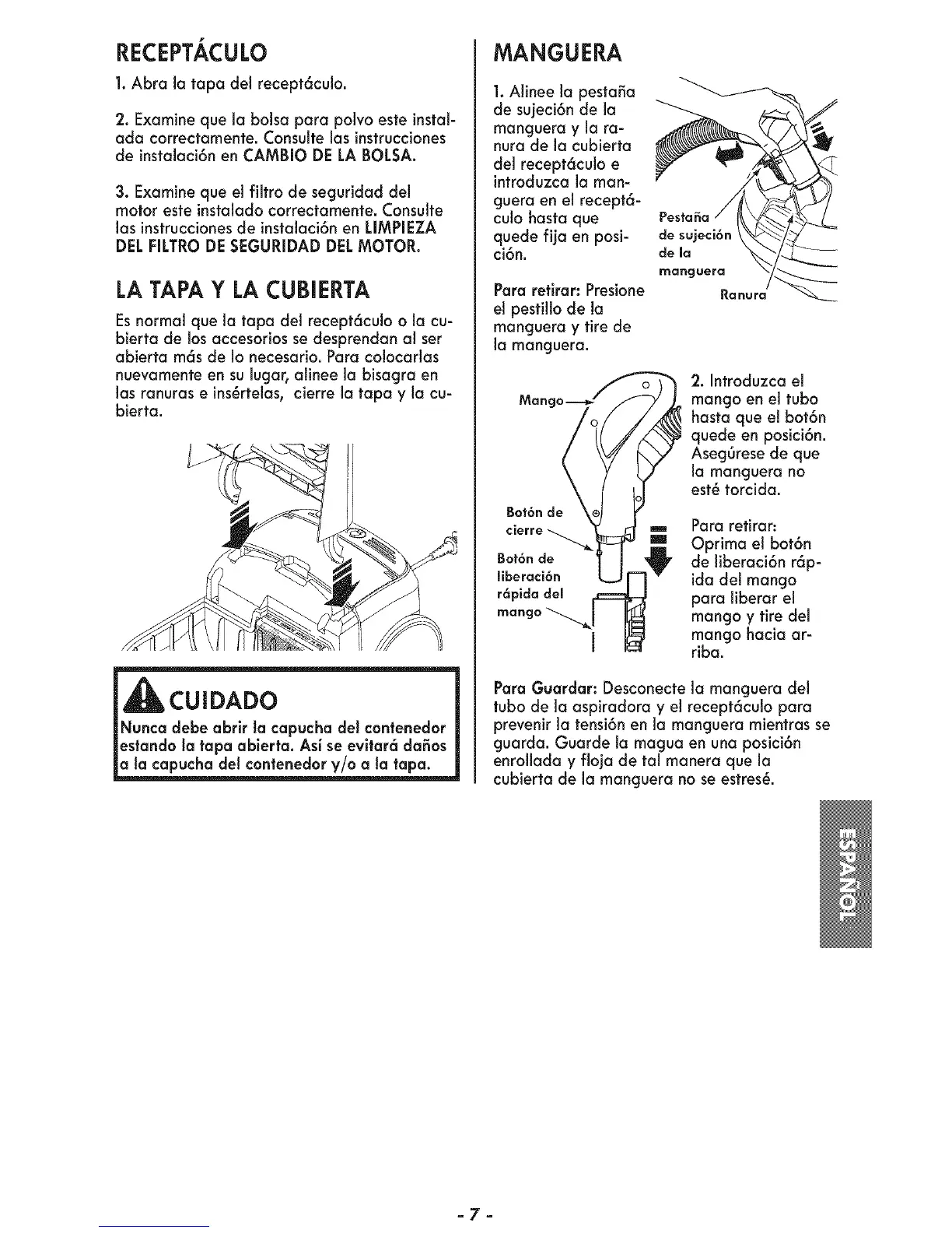 tubo de la aspiradora y el recept6culo para