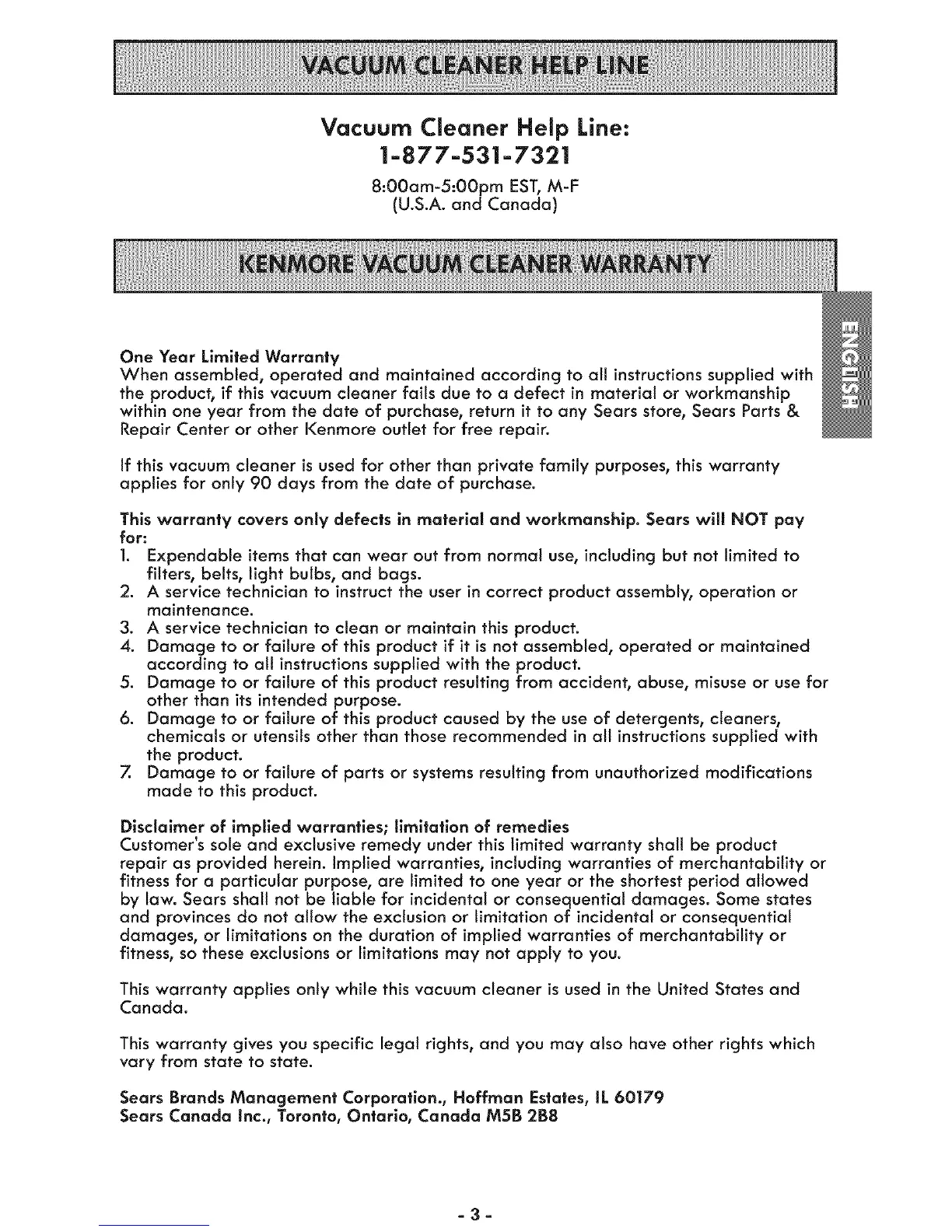 by law. Sears shall not be liable for incidental or consequential damages. Some states