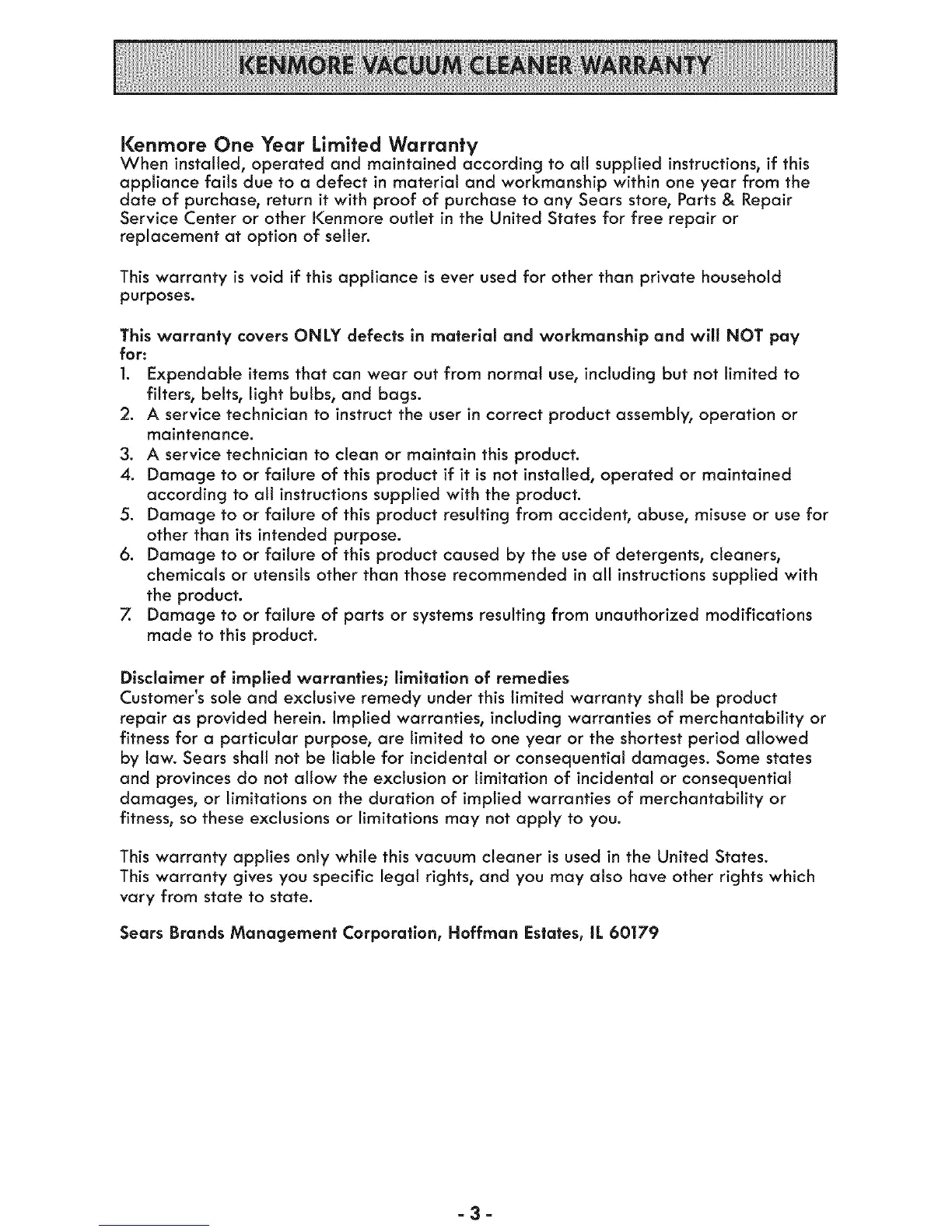Service Center or other I<enmore outlet in the United States for free repair or