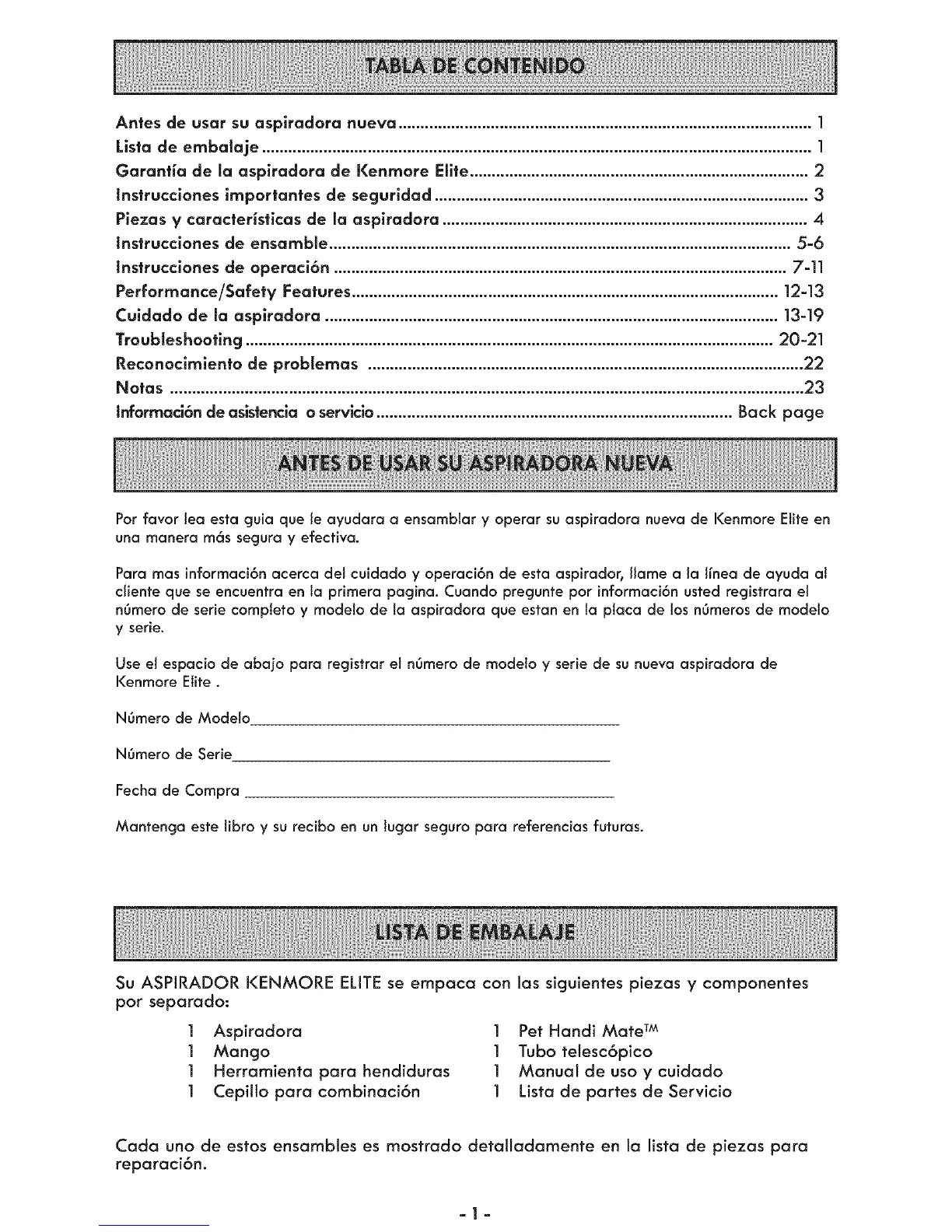 Garanfia de la aspiradora de Kenmore Elite ............................................................................. 2