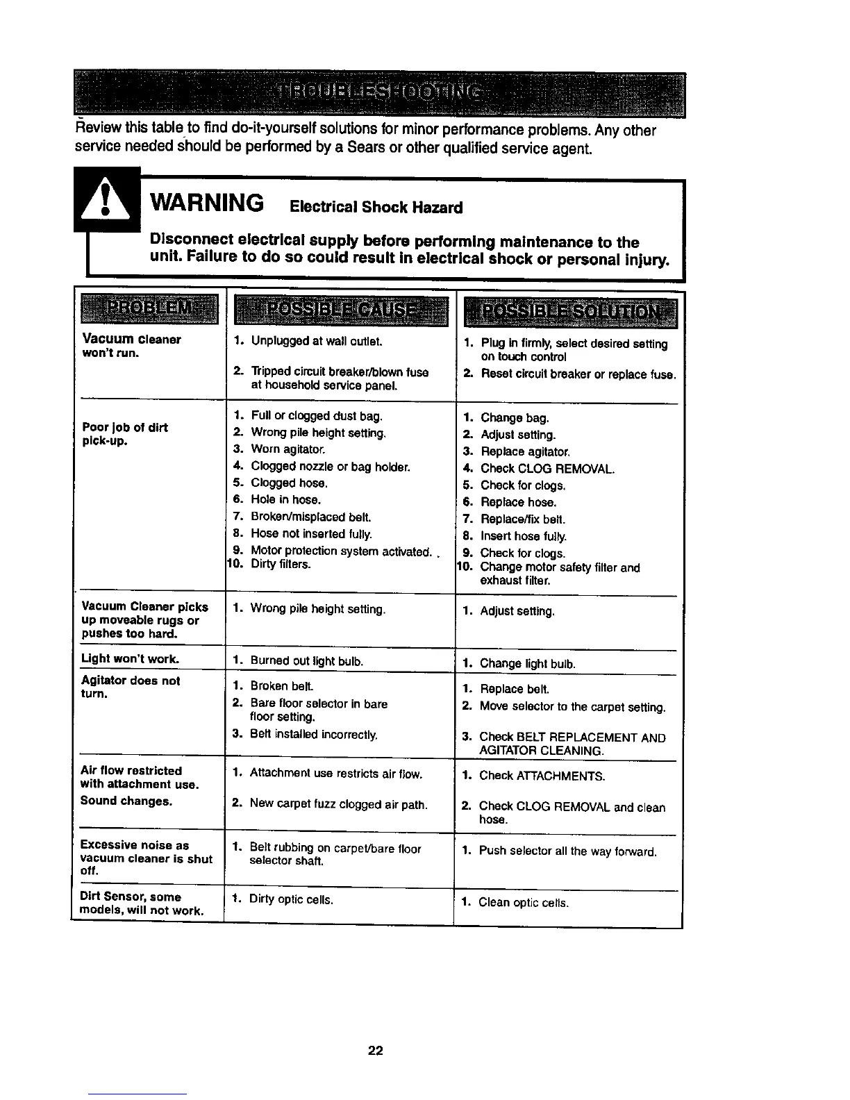 Vacuum Cleaner picks 1. Wrong pileheight setting. 1. Adjust setting.