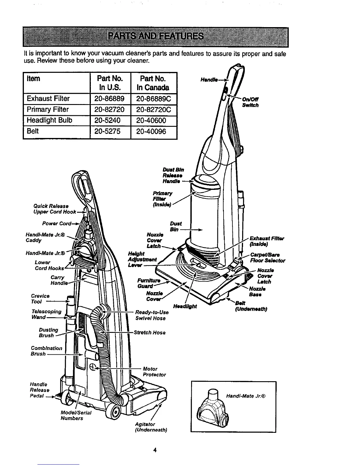 It is importantto know your vacuum cleaner's parts and features to assure its proper and safe
