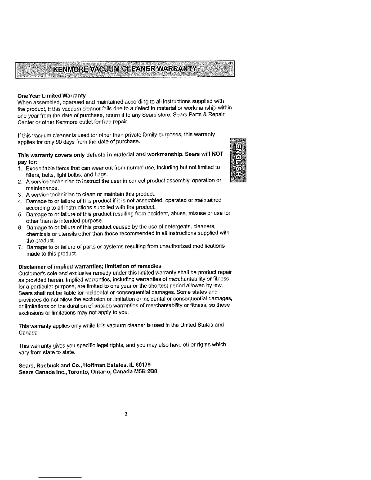 This warranty covers only defects in material and workmanship. Sears wilt NOT