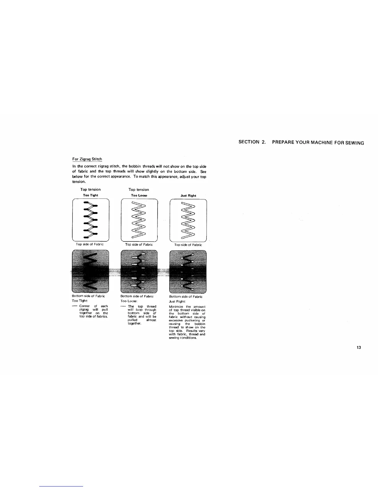 In the correct zigzag stitch, the bobbin threads will not show on the top side