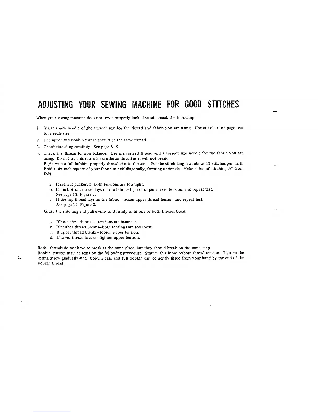 b. If the bottom thread lays on the fabric-tighten upper thread tension, and repeat test.