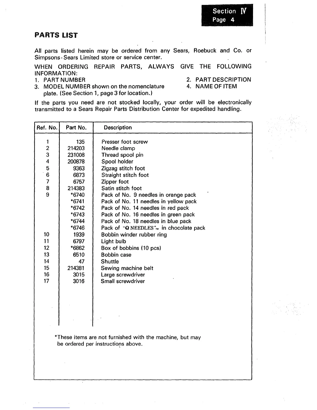 All parts listed herein may be ordered from any Sears, Roebuck and Co. or