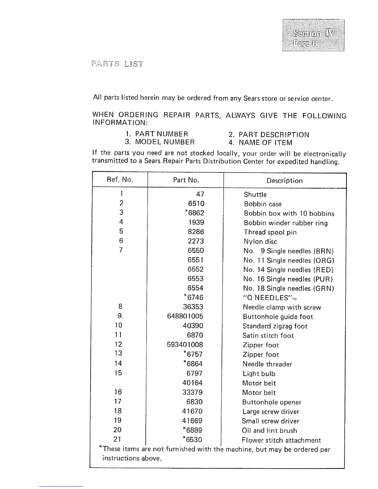 All parts listed herein may be ordered from any Sears store or service center.