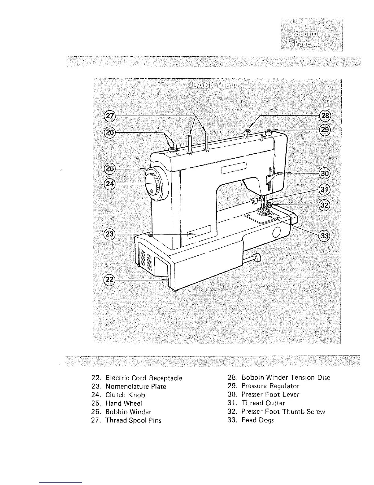 Kenmore 1249 - Back View; Pressure Regulator; Presser Foot Lever; Presser Feet