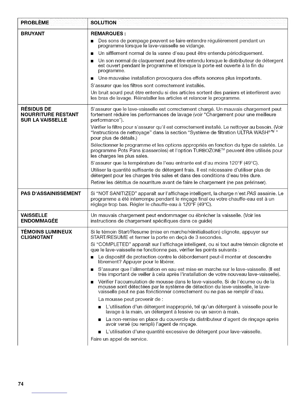 • V6rifier I'accumulation de mousse dans le lave-vaisselle. Si de 1'6cume ou de la