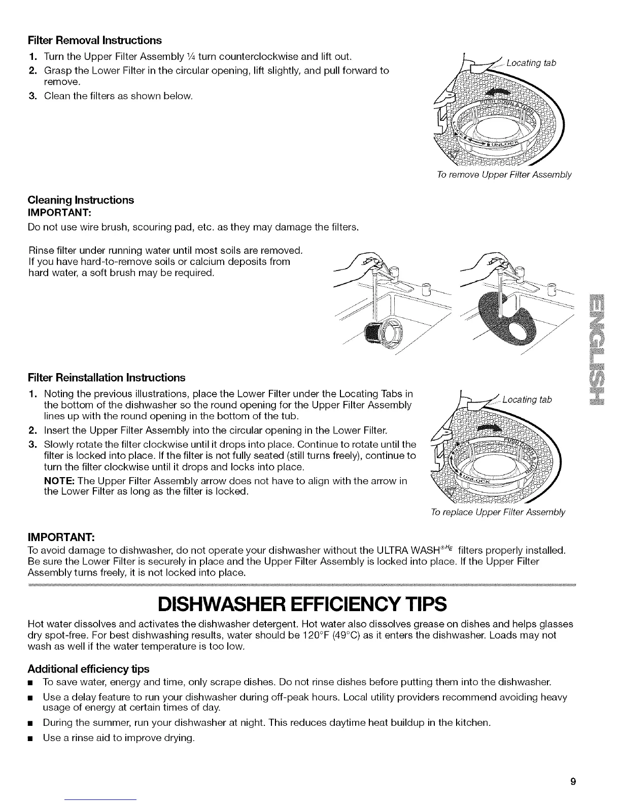 To avoid damage to dishwasher, do not operate your dishwasher without the ULTRA WASH ®HEfilters properly installed.