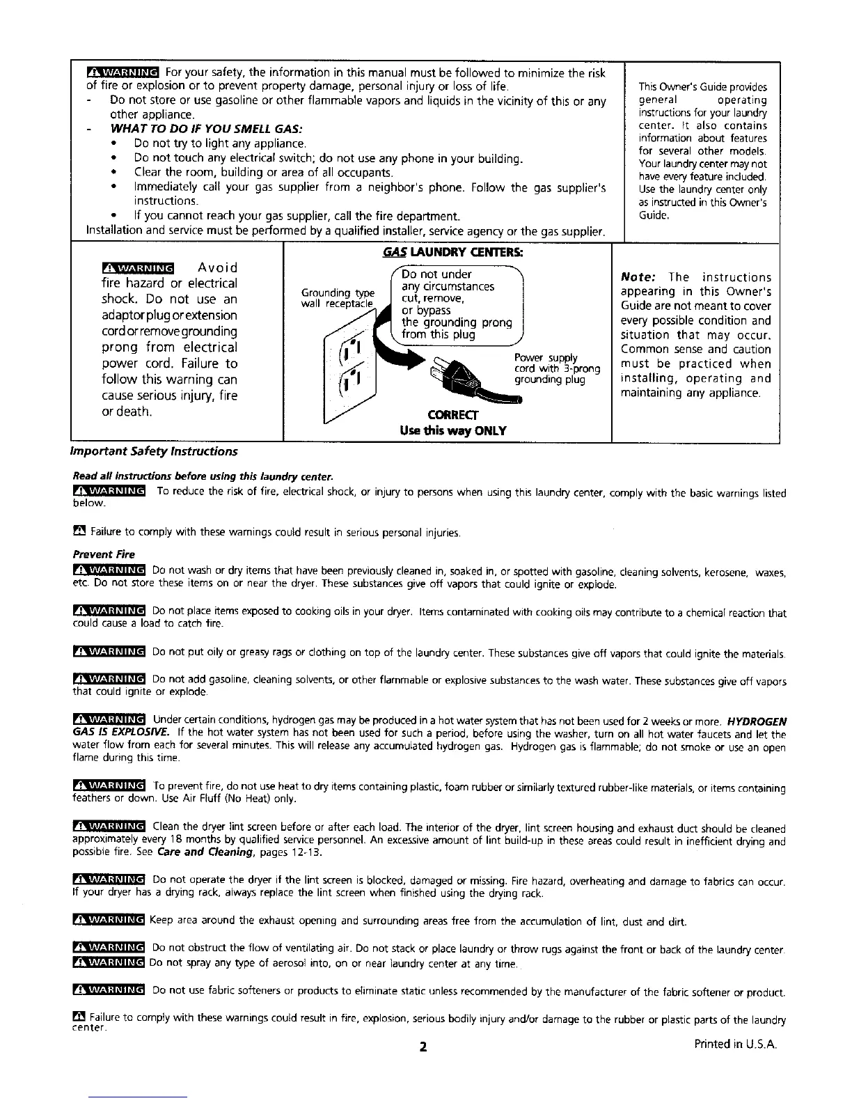 [] Failure to comply with these warnings could result in fire, explosion, serious bodily injury and/or damage to the rubber or plastic parts of the laundry
