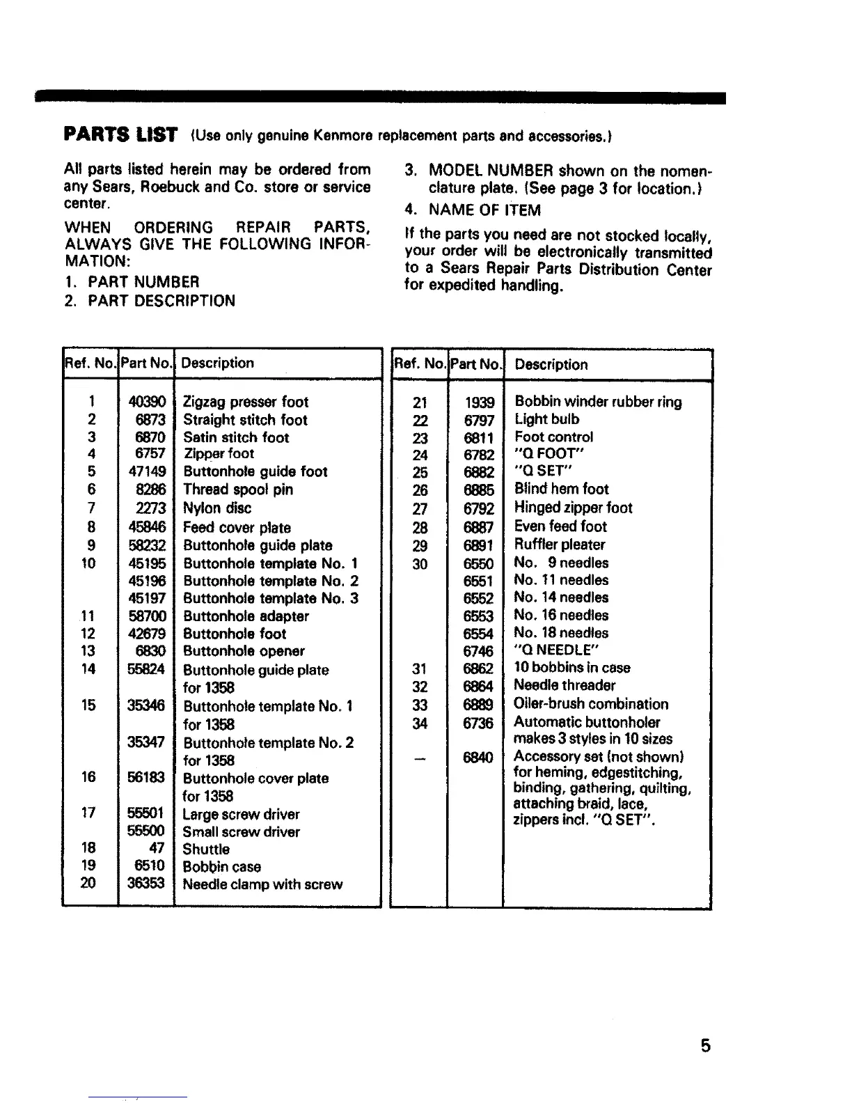 PARTS LIST (Useonly genuine Kenmore replacement parts and accessories,)