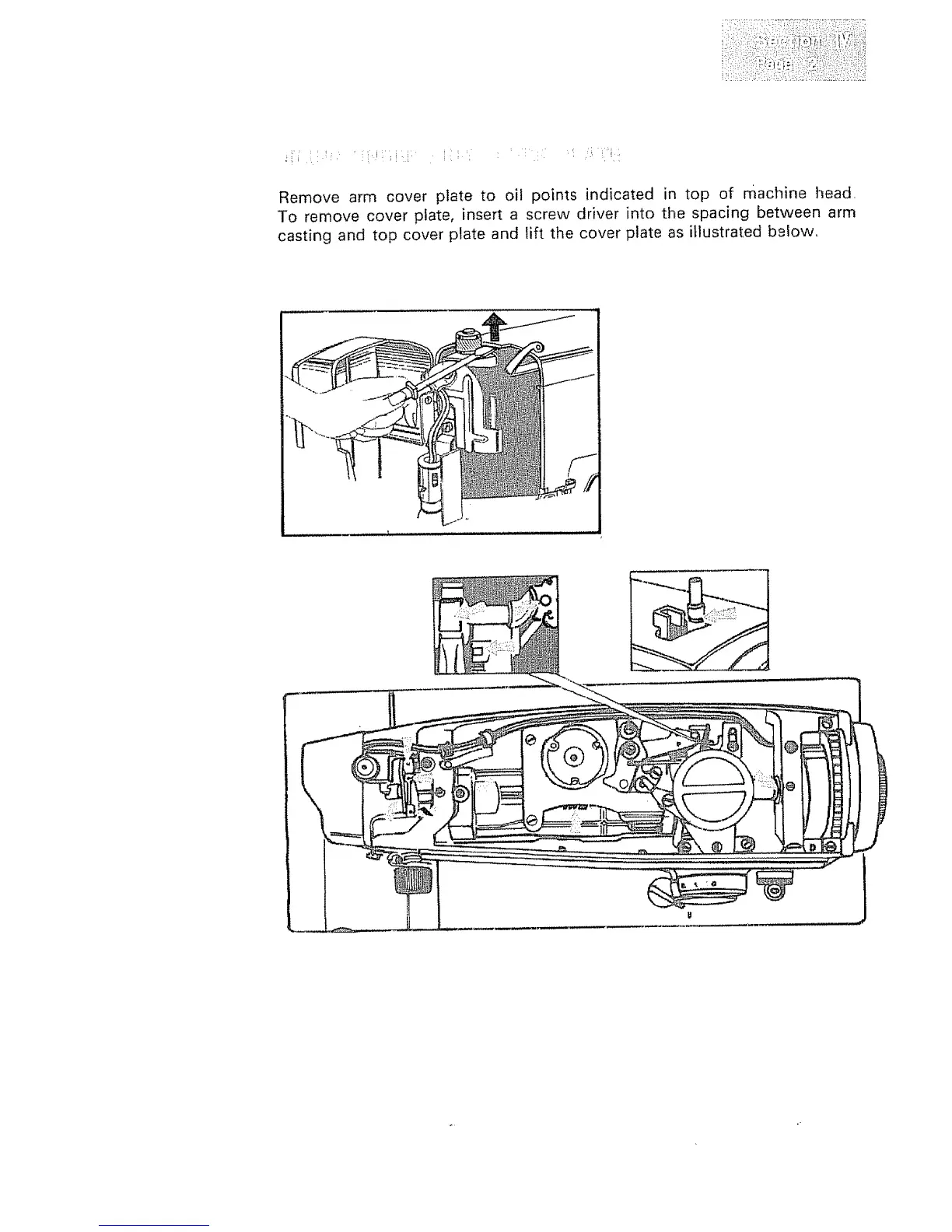 Remove arm cover plate to oil points indicated in top of machine head.