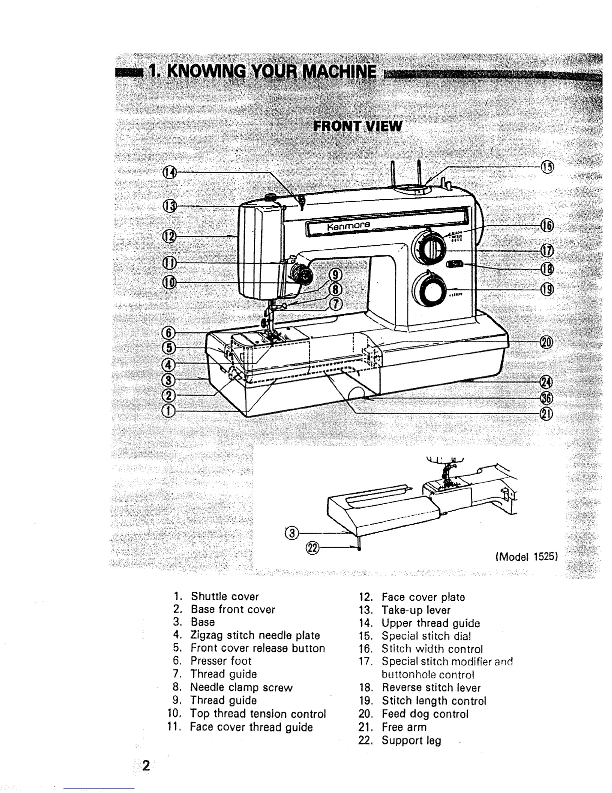 11, Face cover thread guide 21. Free arm