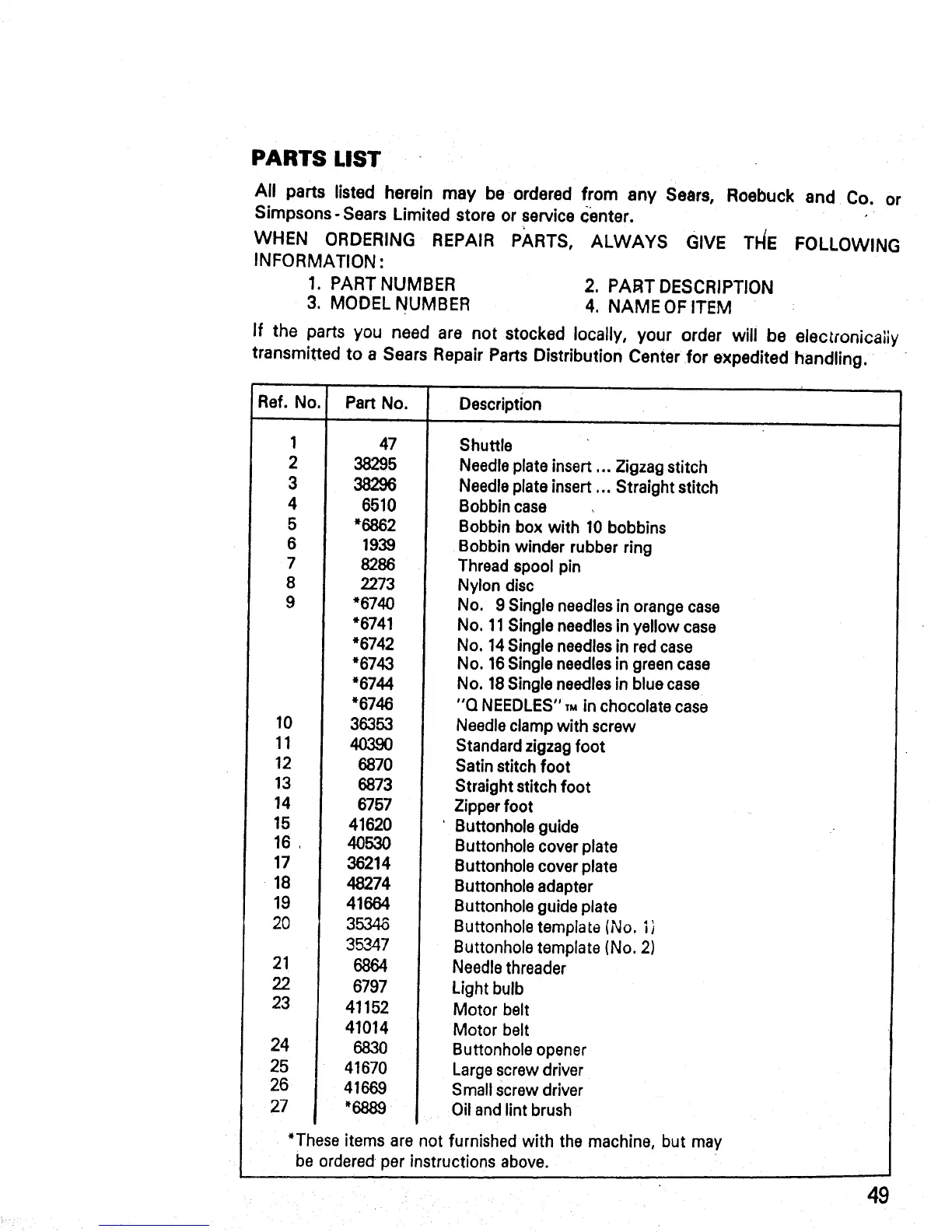 All parts listed herein may be ordered from any Sears,