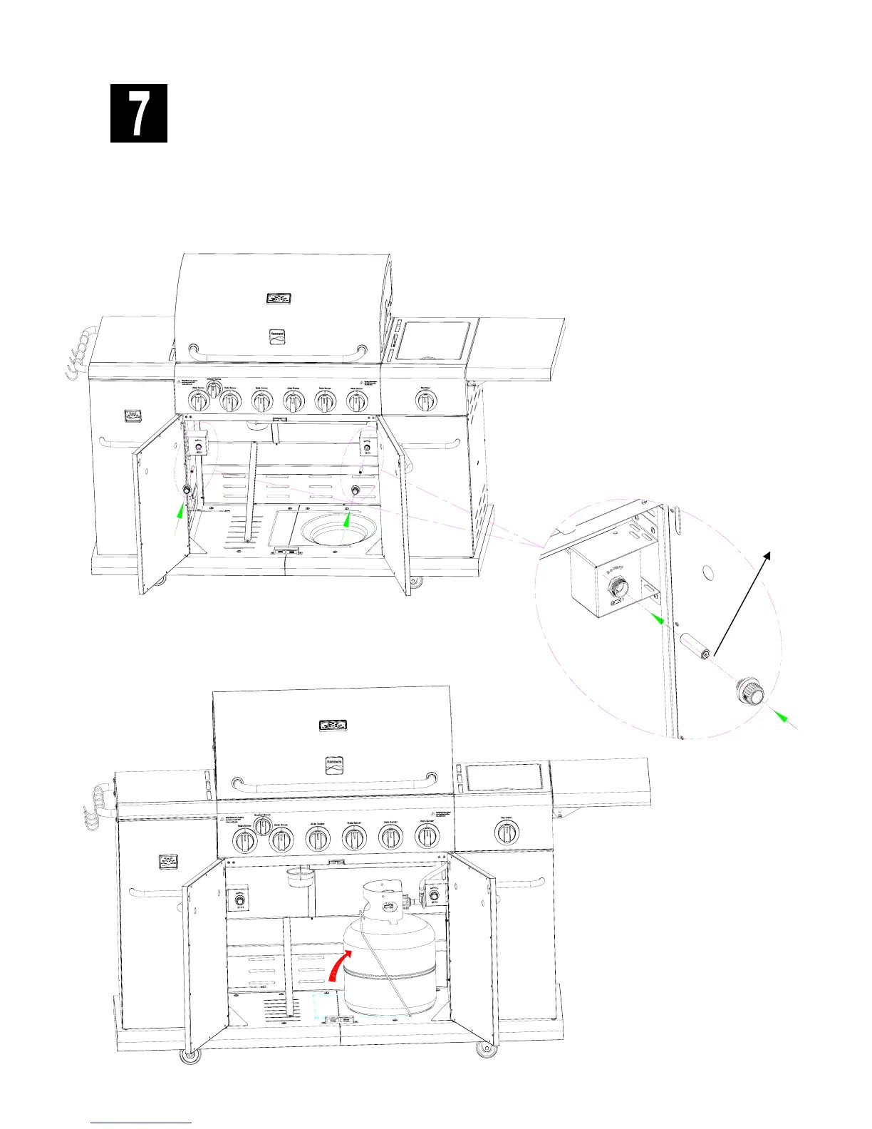 □ Place LP tank into hole in bottom shelf with tank collar opening facing to the front as shown. Raise