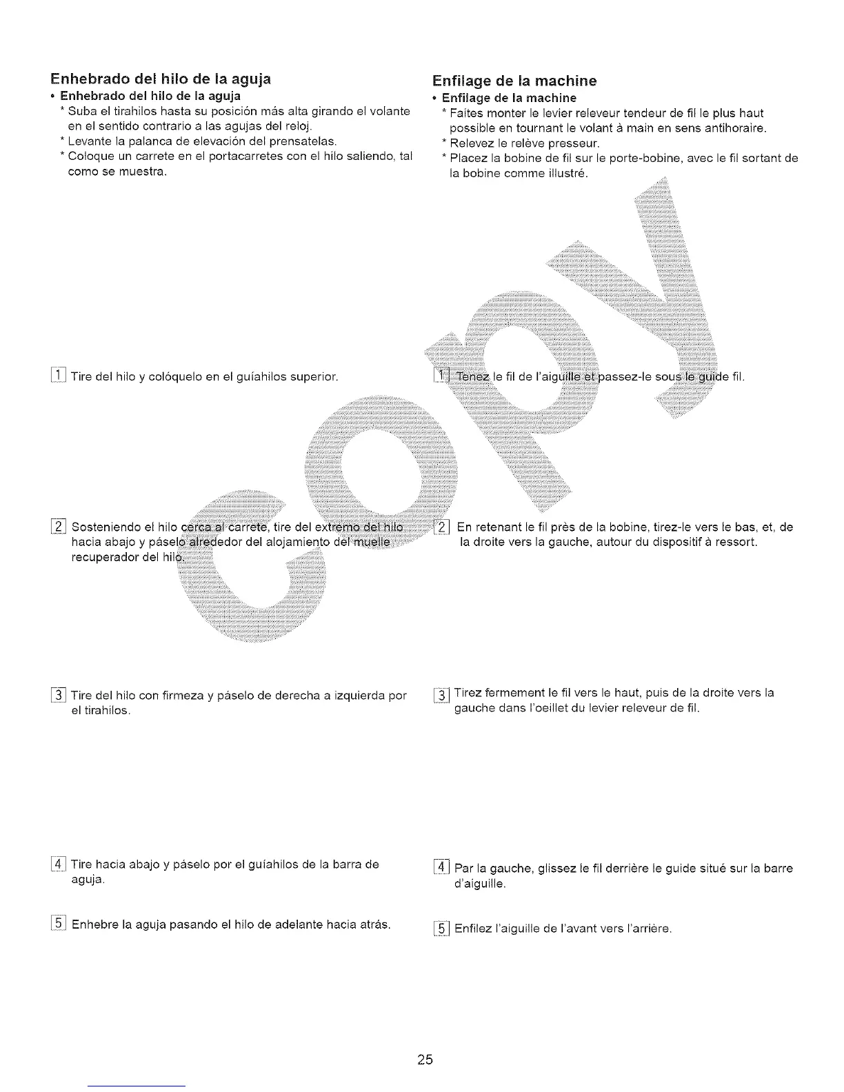 [:51 Enhebre la aguja pasando el hilo de adelante hacia atras. [:_] Enfilez I'aiguille de I'avant vers I'arriere.