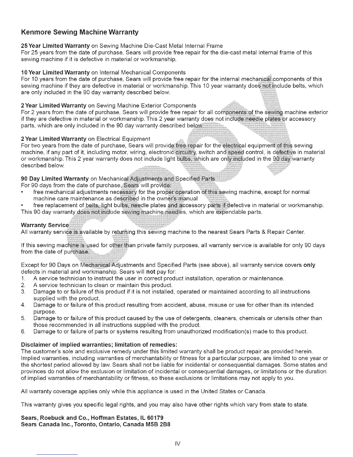 2Year Limited Warranty on Sewing Machine Exterior Components .....