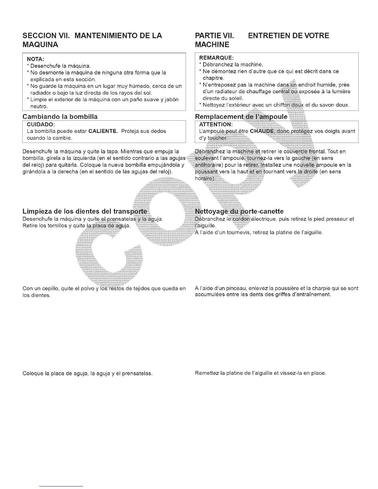 Coloque la placa de aguja, la aguja y el prensatelas. Remettez la platine de I'aiguille et vissez-la en place.